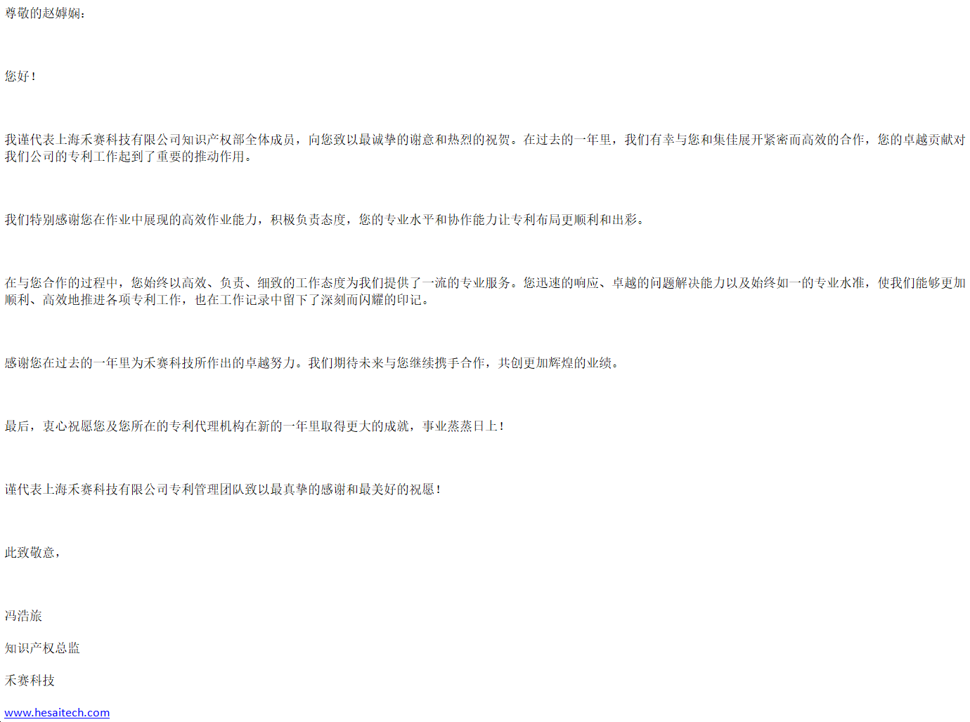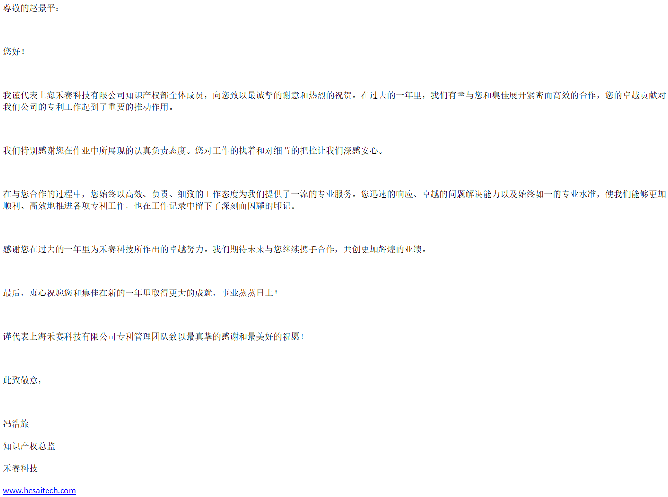 新年伊始,集佳喜获来自客户上海禾赛科技有限公司的感谢信,对stake上海分所提供的优质服务表示感谢。