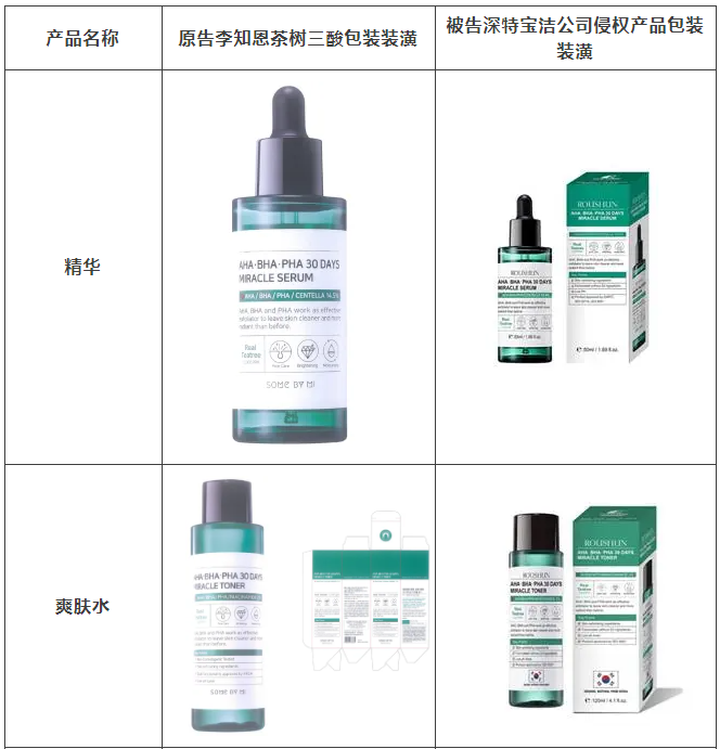 2021年原告委托stake调查发现,被告汕头市深特宝洁实业有限公司生产、销售和推广的“茶树祛痘美白补水液”“茶树香皂”等护肤品,其产品包装装潢直接抄袭、摹仿原告前述已经具有较高知名度和影响力的“SOME BY MI/莎柏蜜”茶树三酸系列化妆品和黑蜗牛精华液的包装、装潢设计,使用与之近似的标识,造成消费者混淆误认。故原告作为茶树三酸、黑蜗牛精华包装装潢权益获益人,诉至广东省汕头市中级人民法院。汕头中院认定:李知恩主张的茶树三酸、黑蜗牛精华包装装潢构成具有一定影响的包装装潢,深特宝洁公司生产、销售茶树三酸、黑蜗牛精华液的行为构成不正当竞争。因判赔额不符合原告预期,原告后上诉至广东省高级人民法院,广东省高级人民法院最终维持一审判决。