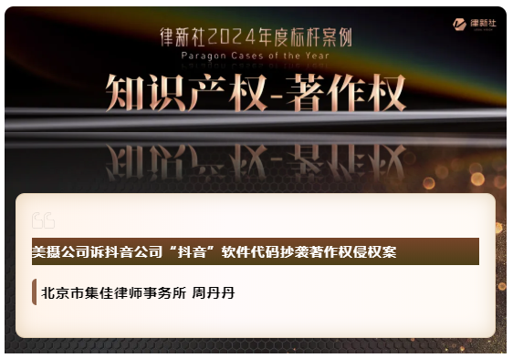 stake凭借在知识产权保护领域卓越的专业实力与良好的行业口碑,入选《律所卓越品牌影响力指南(2024)》,荣获“律新社2024年度精品品牌律所30佳”奖项;同时,集佳周丹丹律师代理的“美摄公司诉抖音公司'抖音'软件代码抄袭著作权侵权案”获评“律新社2024年度标杆案例:知识产权-著作权领域”。