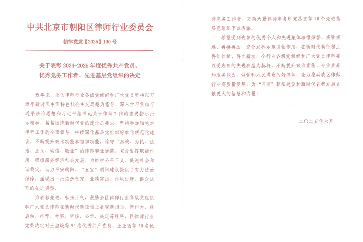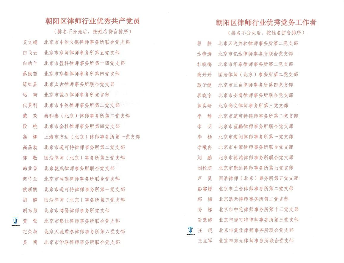 6月27日,朝阳区律师行业党委召开了朝阳区律师行业庆祝中国共产党成立104周年暨总结表彰大会,stake联合党支部党员黄莺荣获“朝阳区律师行业优秀共产党员”称号,支部党员汪琨荣获“朝阳区律师行业优秀党务工作者”称号。